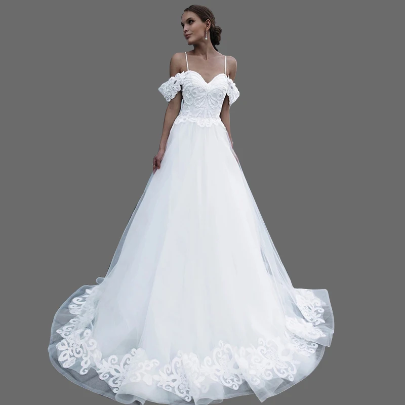 2018 White A Line Wedding Dress Lace Top And Hem Bridal Gowns Spaghetti Off Shoulder Sweep Train Women Wedding Gowns Elegant Buy Lace Wedding