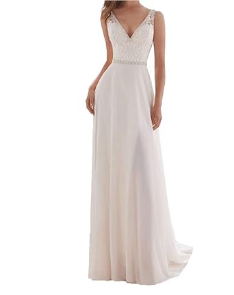 Sheer Lace Top V Neck A Line Long Chiffon Wedding Dress With