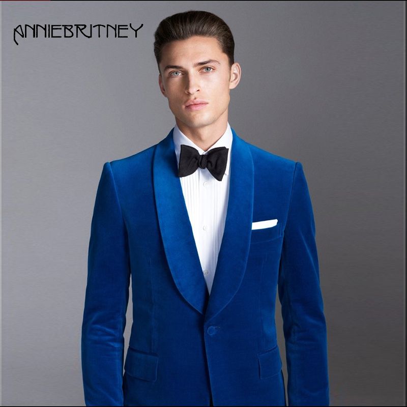 Bleu Royal Velours Hommes Costumes Pour Mariage Deux Pièces Veste