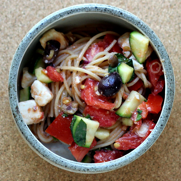 When the pasta is done, drain it well, then add it to the vegetables in the bowl and mix well. The oil, juice from the tomatoes, and the feta that breaks up will form a sauce. The longer the pasta sits, it will absorb the liquid. Add more oil, if you like.